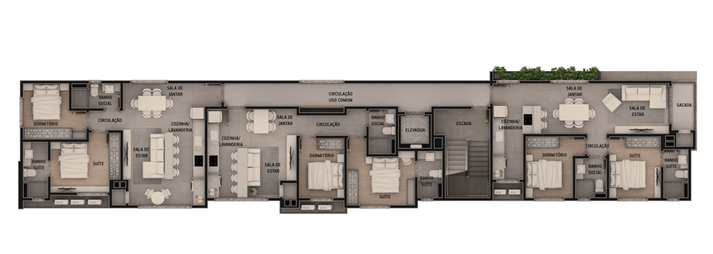 Algumas unidades contam com sacada e churrasqueira, oferecendo mais conforto no dia a dia. Com apenas três apartamentos por andar, o projeto garante mais privacidade e exclusividade para os moradores.